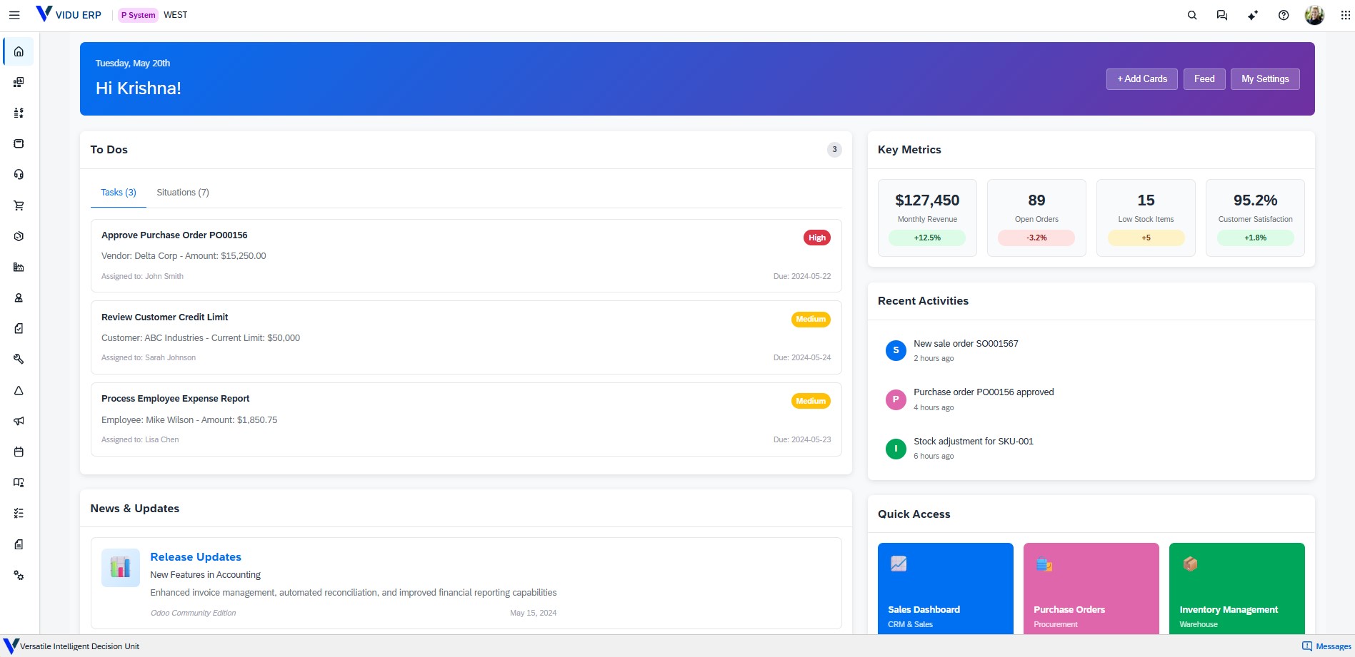 VIDU ERP brings together the clarity of SAP-grade UX, the scalability of cloud-native architecture, and the flexibility of Odoo. A modern ERP engineered for growing enterprises that demand speed, intelligence, and precision.