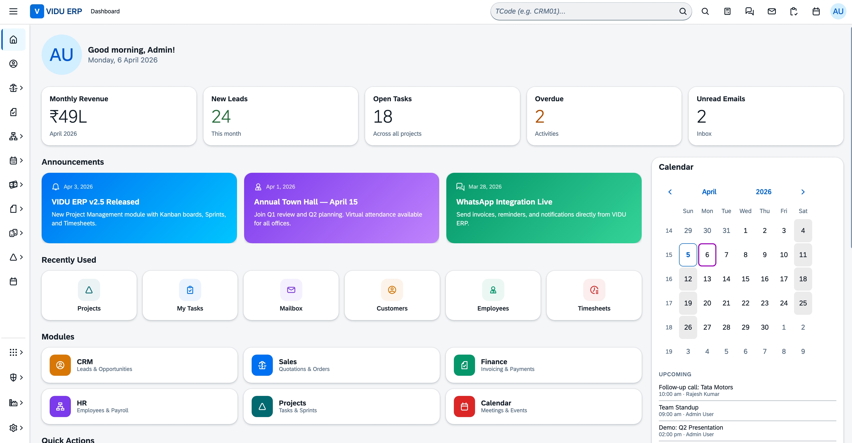 VIDU ERP brings together the clarity of SAP-grade UX, the scalability of cloud-native architecture, and the flexibility of Odoo. A modern ERP engineered for growing enterprises that demand speed, intelligence, and precision.